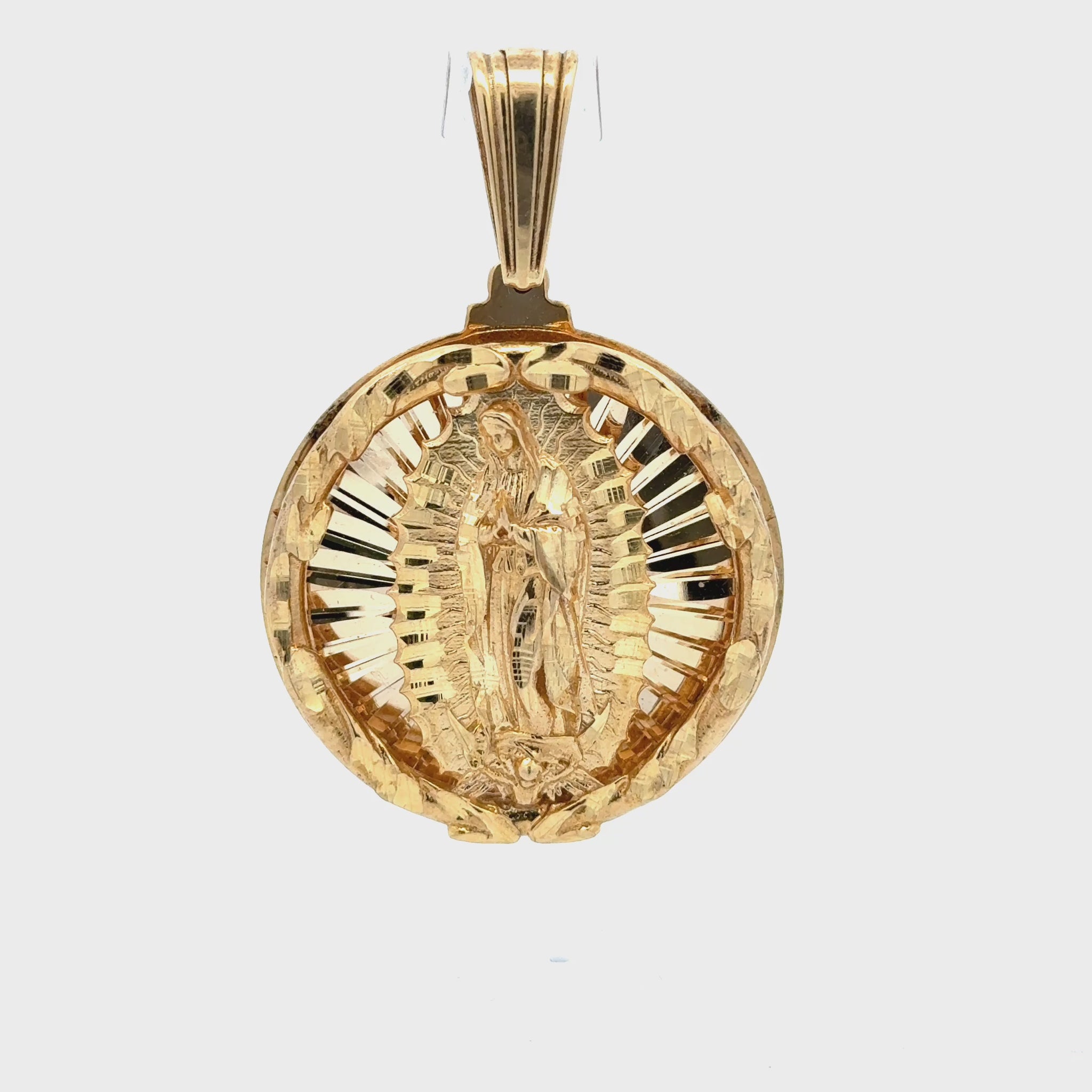 The detailed engraving of the Blessed Virgin Mary is surrounded by a radiant sunburst pattern, representing light, hope, and spiritual strength.